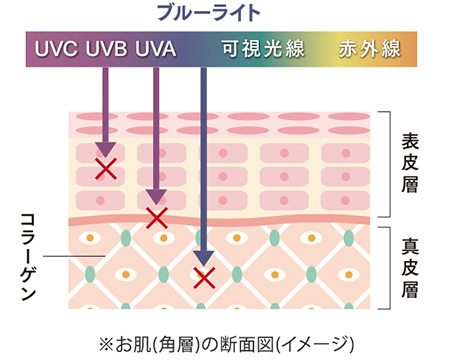 目への悪影響で知られるパソコンやスマートフォンなどのブルーライトは目だけに入るものではありません。パソコン画面の前で仕事している間中、お顔の肌にも降り注いでいます。ブルーライトは紫外線よりも波長が長く、浴び続けるとお肌に異常な色素沈着を引き起こします。紫外線よりもブルーライトの方がシミの原因になりやすいのです。「スマホ焼け」しているあなた、ブルーライトカットをお忘れなく。