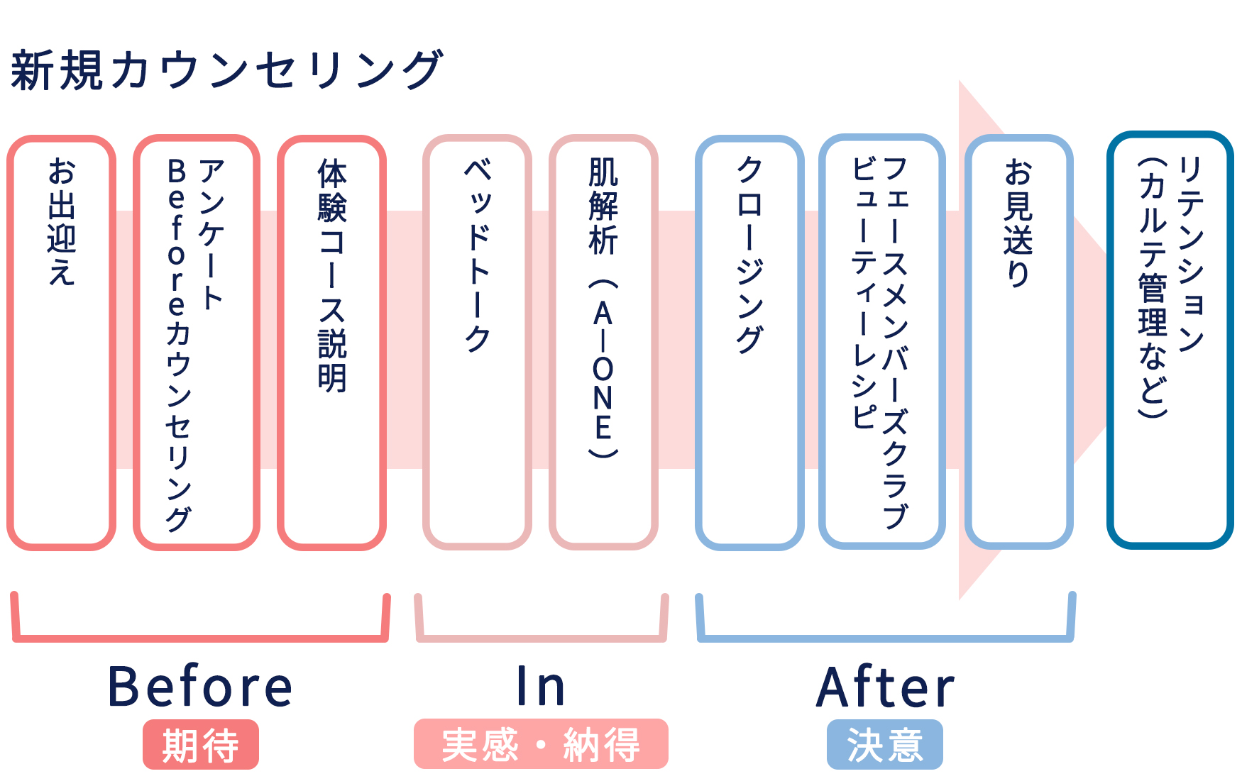 新規カウンセリングは、お出迎えからリテンション(カルテ管理など)まで、Before・In・Afterの3構成で行います。