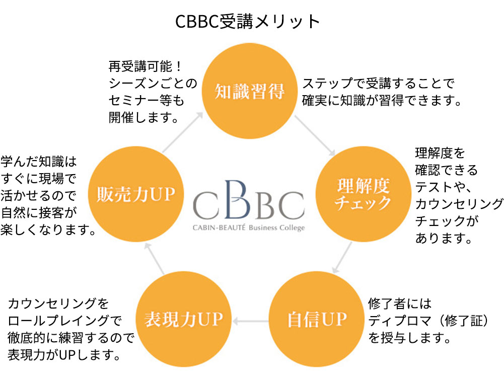 スタッフのスキルアップを図るには、研修が有効です。特に、エステサロン向けに特化した専門的な研修は、実践的で大きな効果をもたらします。たとえば、フェースが運営しているサロンスタッフ教育機関「キャビンボーテ・ビジネス・カレッジ(CBBC)」では、カウンセリングのロールプレイングを徹底的に行います。確実に経験を積み上げ、お客様への表現力を高められると人気で、全国から多くのサロンスタッフが訪れています。