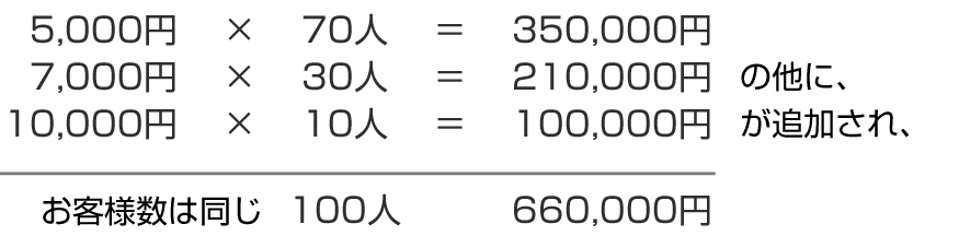 5,000円の施術コースのお客様が70人、7,000円の施術コースのお客様が30人いるとすると、