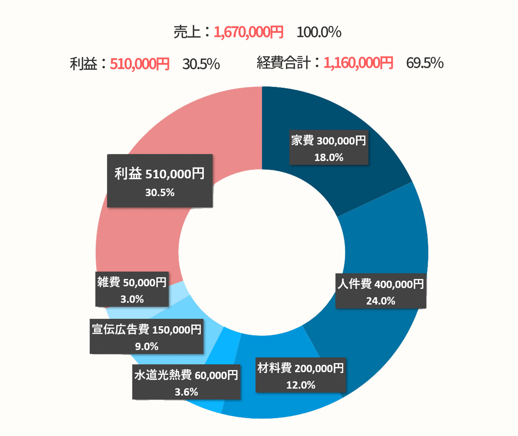 物販売上は売上が増えても経費が増えないのが良いところです。家賃、人件費、材料費、水道光熱費など、どの項目の
