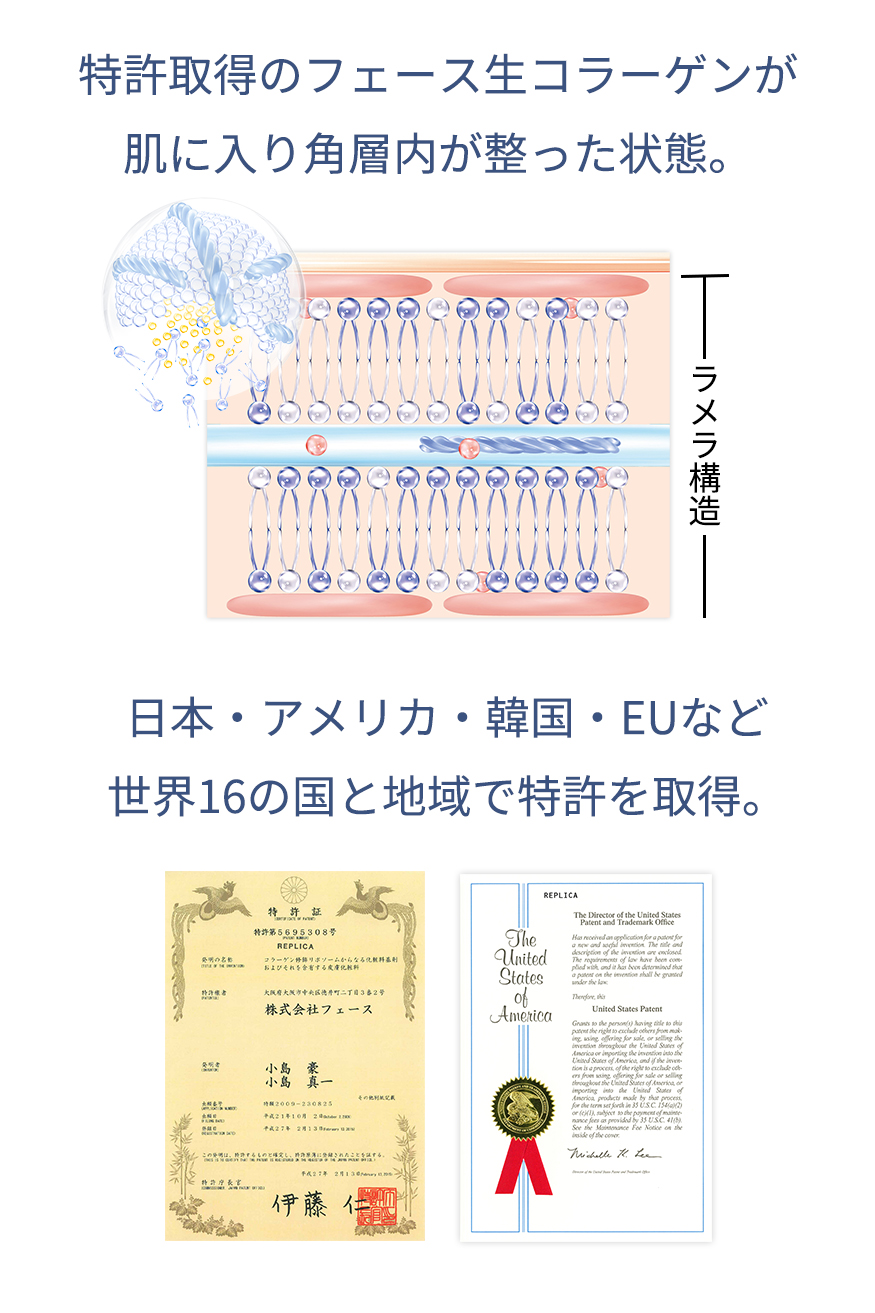 数あるエステサロン専用化粧品の中で、エビデンスと肌結果で人気サロンに支持されている化粧品のひとつが、フェース化粧品です。 30年以上の歴史と実績を誇り、世界16の国と地域で特許を取得しているオリジナル浸透技術を持っています。特に注目すべきは「フェース生コラーゲン」を配合した製品で、塗るだけで肌に効果が現れます。この技術により、角層を根本からケアし、肌の美しさを引き出す効果が証明されています。