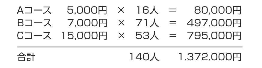 コースが仮にAコース5,000円、Bコース7,000円、Cコース15,000円の3つあるとしてみましょう。半分のお客様がAコース、4割がBコース、1割がCコースとすれば、